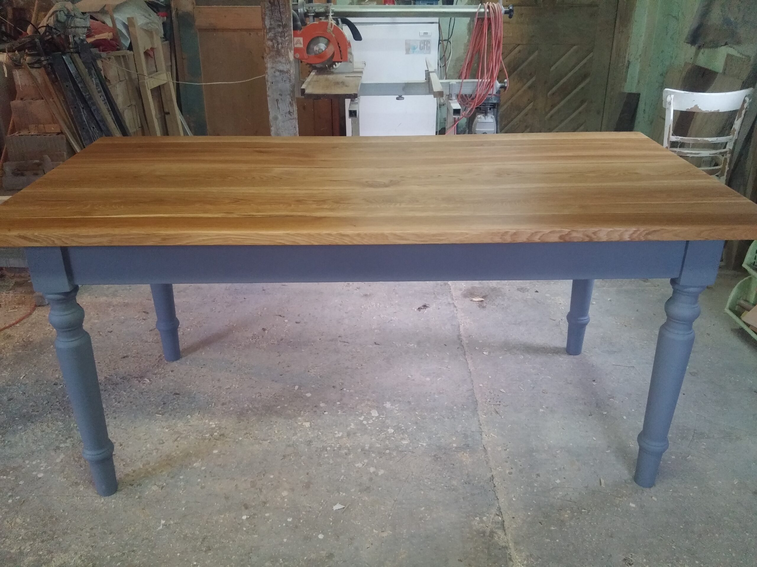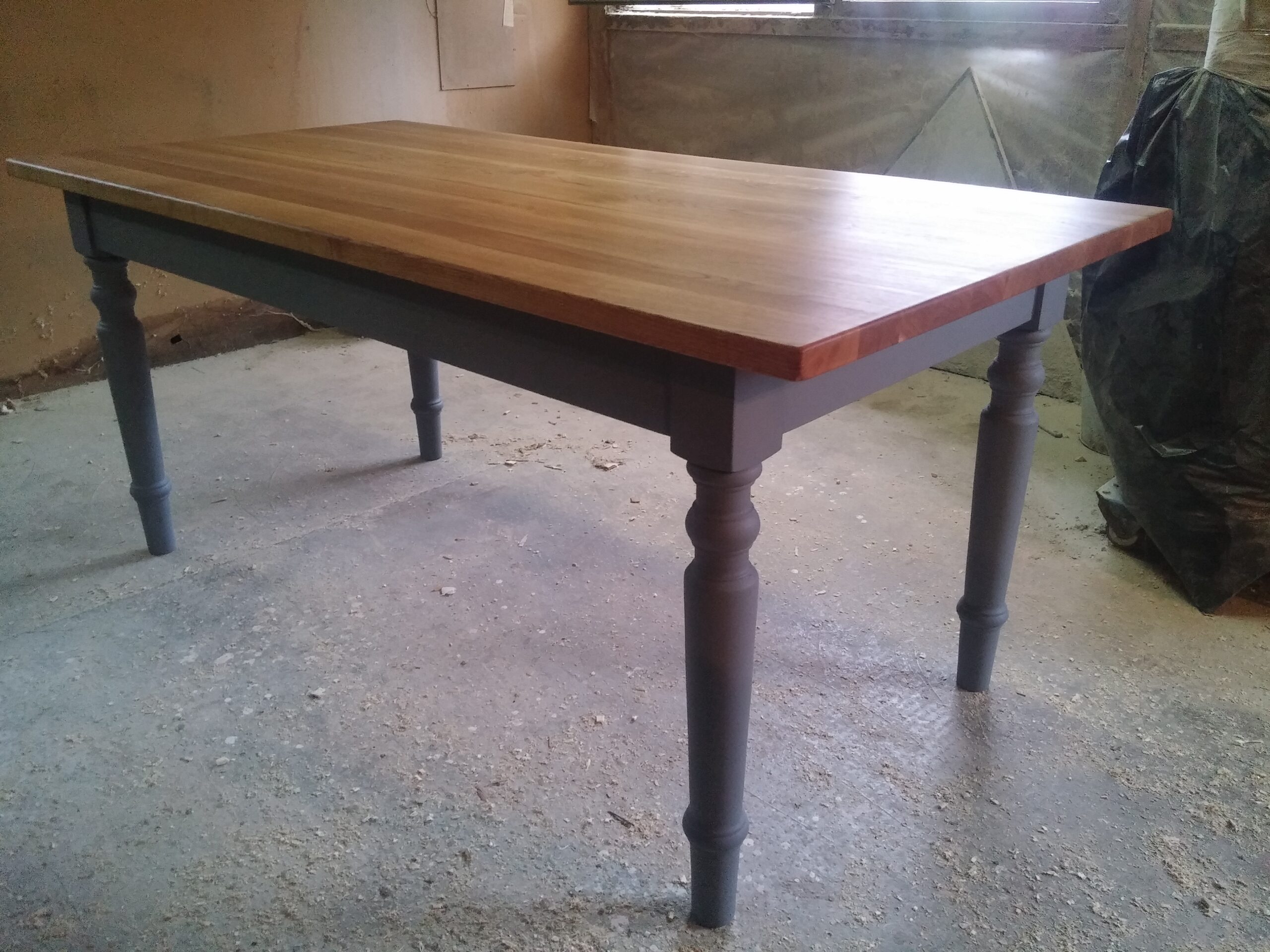 Tölgy fából készült ,esztergált lábú étkezőasztal. A képen olajozott tölgy asztaltető ,szürkére festett fenyőlábbal. A felület kezelésben a szin eltérhet a képen lévőtől a fa fajtája, mintázata miatt ezért a felület kezeléshez egyeztetés szükséges! Igény szerint egyedi méretben és szinben is rendelhető, ehhez kérjen egyedi ajánlatot az elérhetőségem bármelyikén, vagy az oldalon.Csak rendelésre vásárolható, elkészitési és szállitási idő 3-6 hét. A termék nem lapraszerelt, hanem összeszerelt állapotban szállitható. Az ár ,natúr kezeletlen felületre vonatkozik.